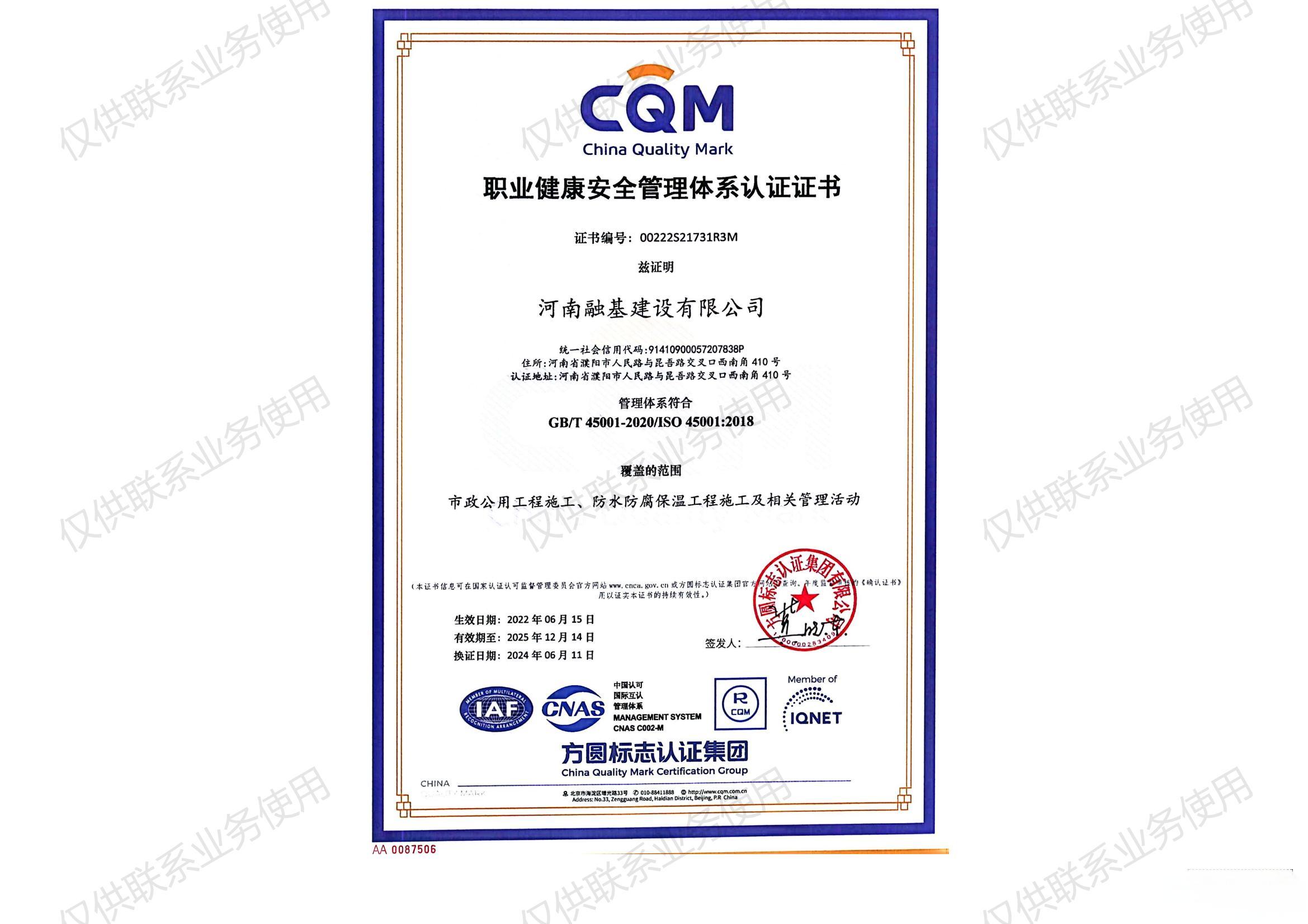 職業(yè)健康安全管理體系認(rèn)證證書