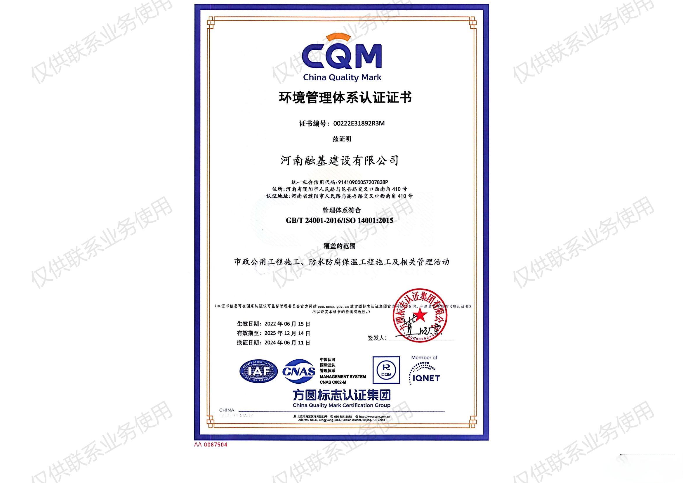環(huán)境管理體系認(rèn)證證書