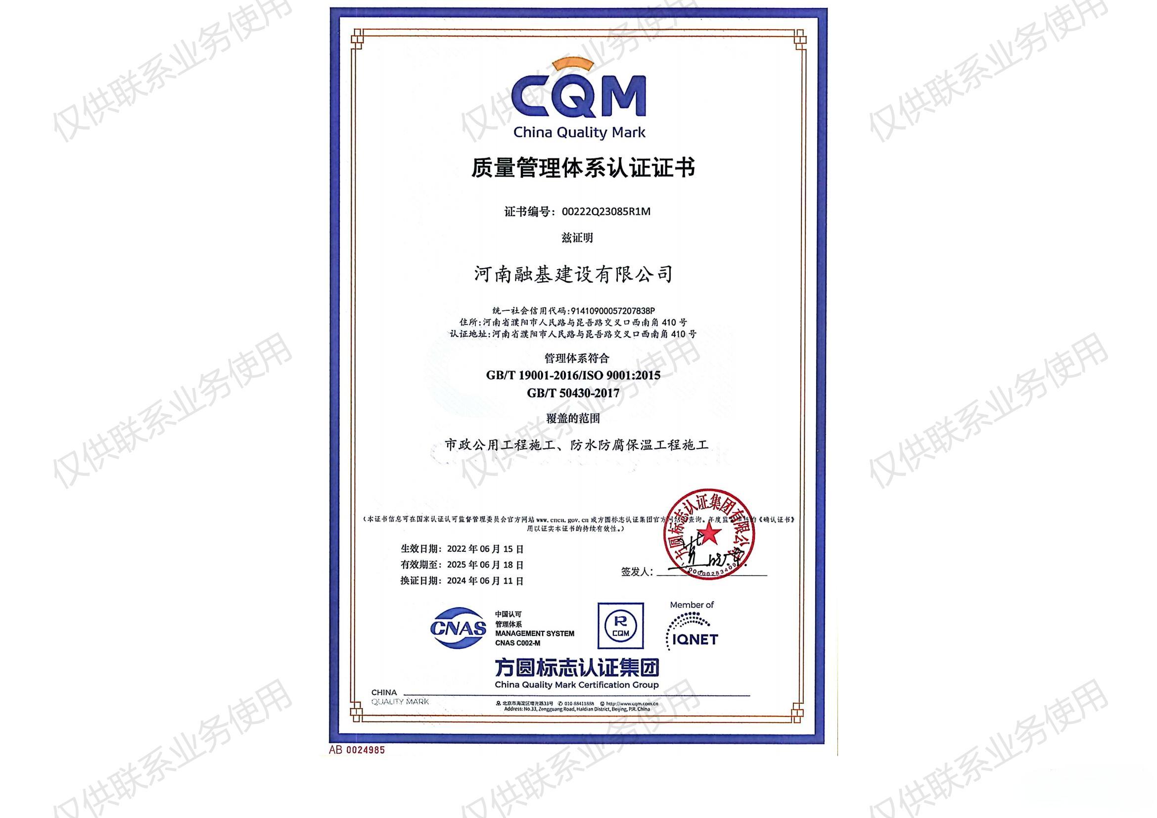 質(zhì)量管理體系認(rèn)證證書